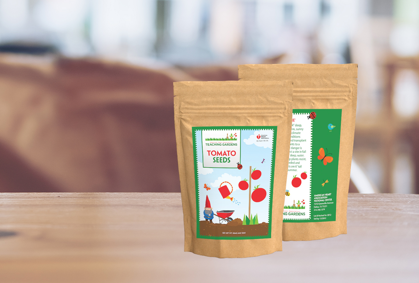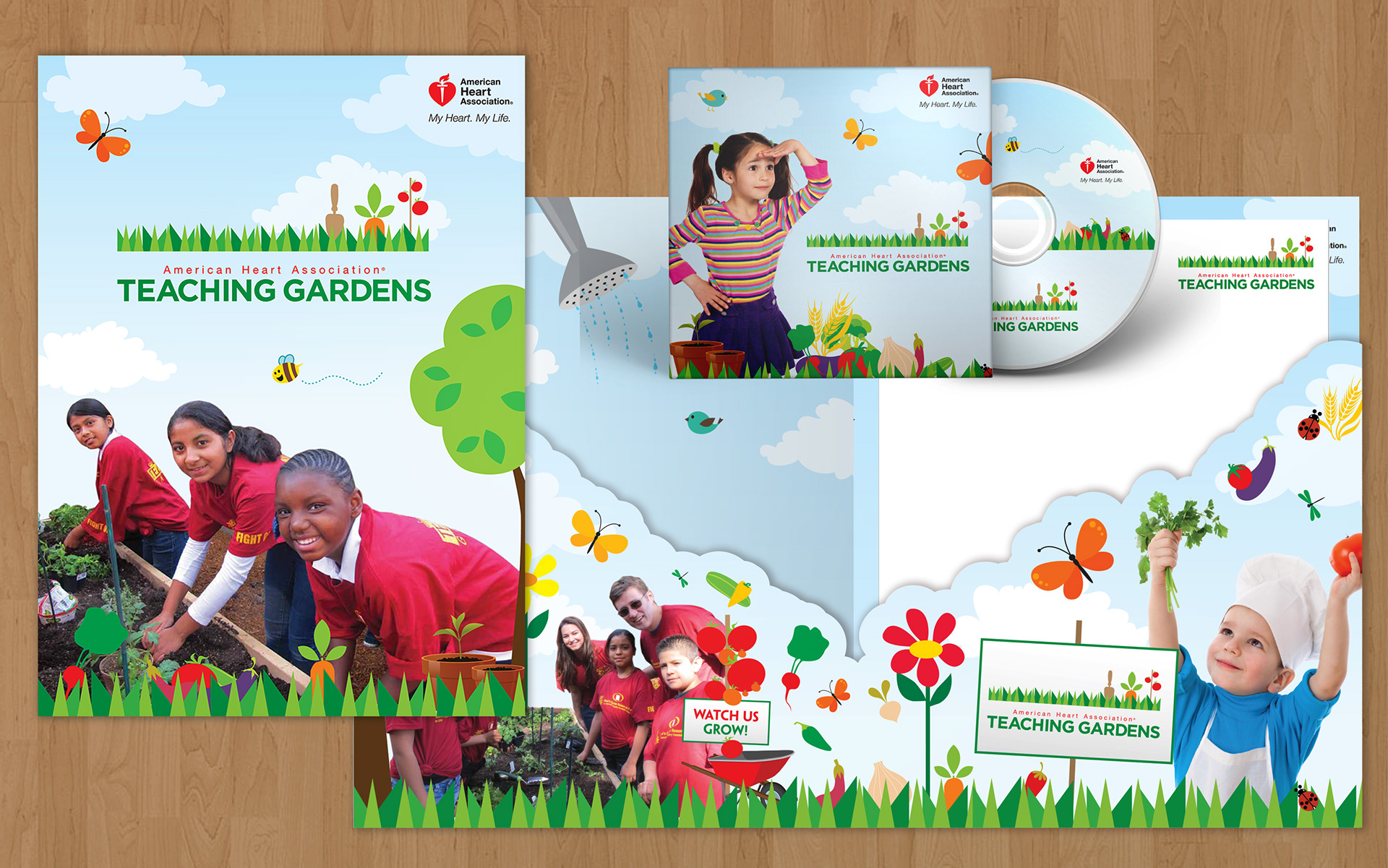This press kit for American Heart Association's Teaching Gardens program was designed with vibrant colors, and illustrative graphics derived from the Teaching Gardens logo, combined with actual photos from schools involved in the program. Plantable tomato seeds came with the kit as an incentive.