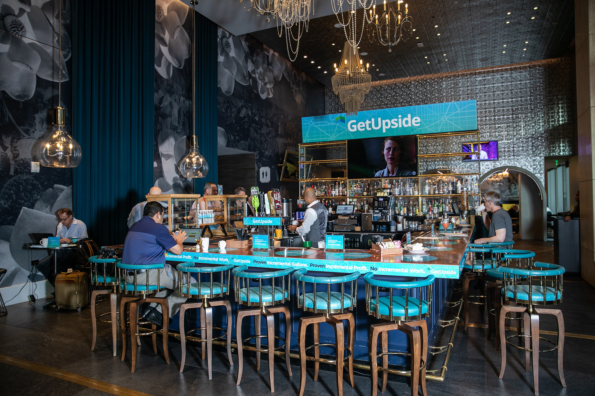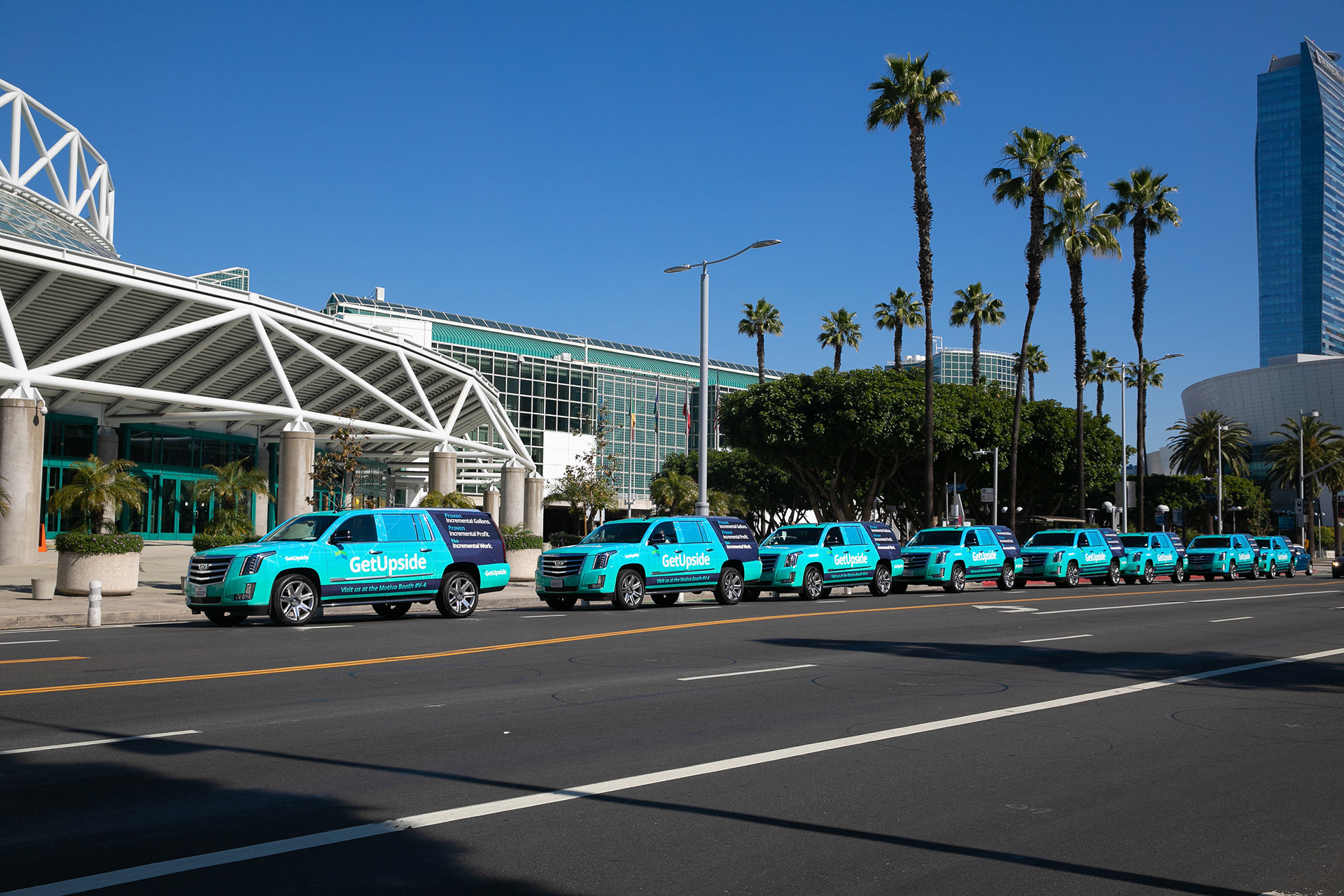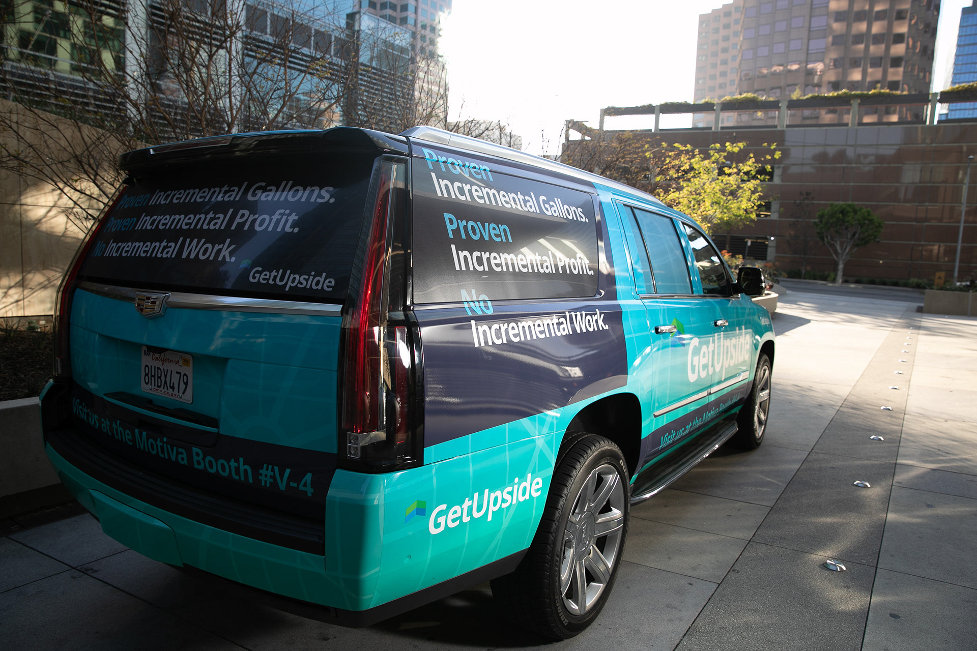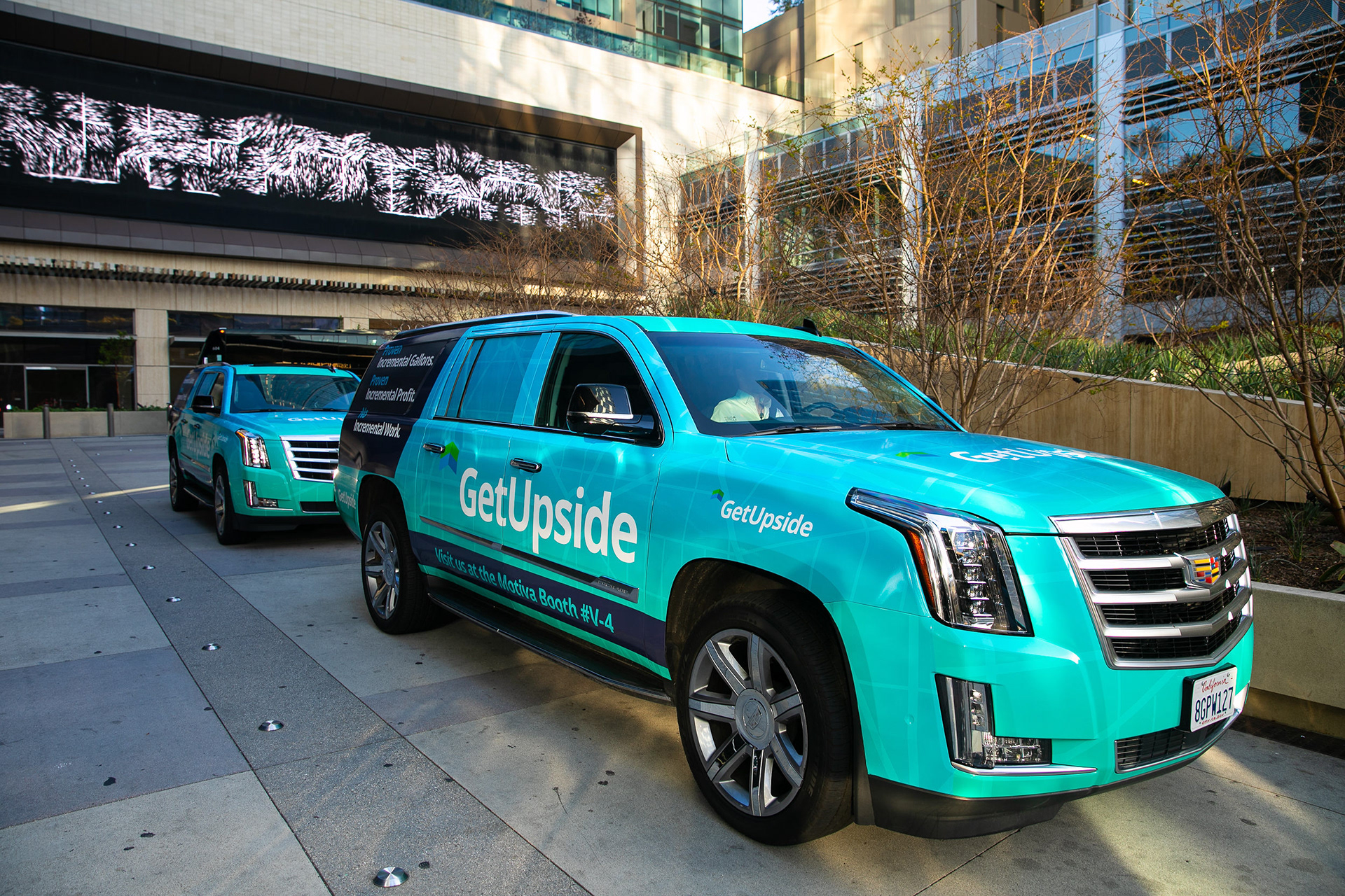 GetUpside wanted to raise brand awareness to guests visiting town for a fuel convention at the LA Convention Center. A nearby hotel lobby was transformed into a brand activation with graphics adorning the bar, cocktail tables and surrounding spaces. A fleet of SUVs were wrapped with custom graphics and used to transport attendees to the convention.