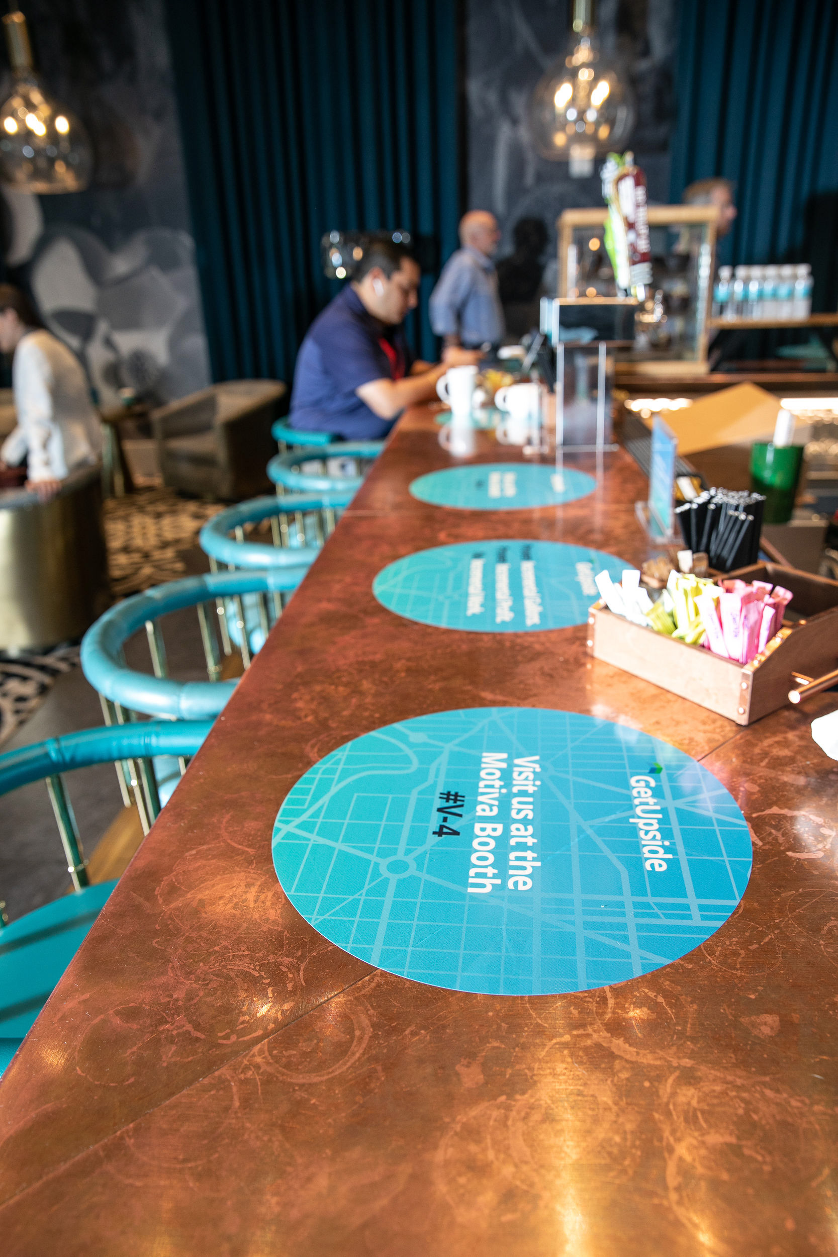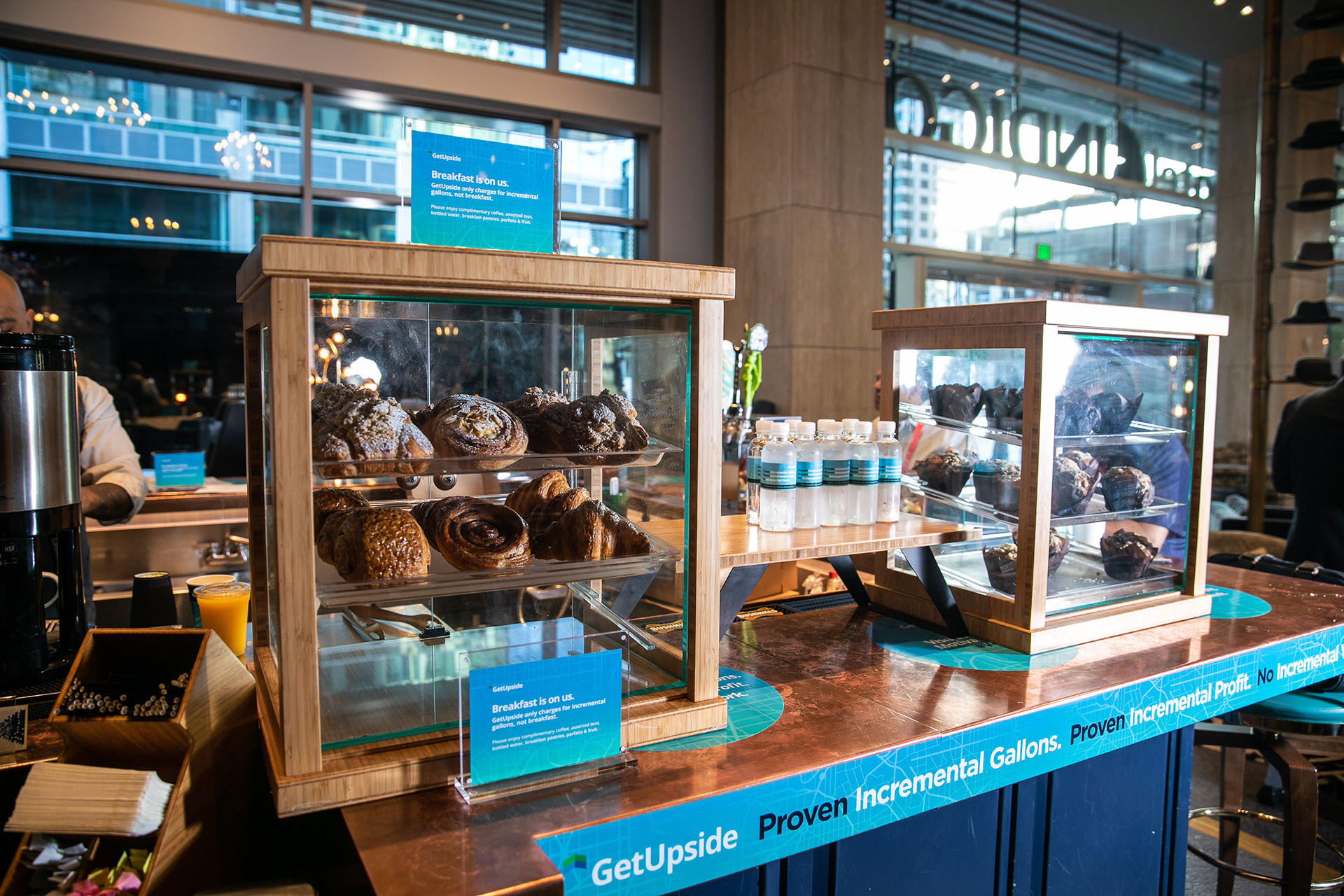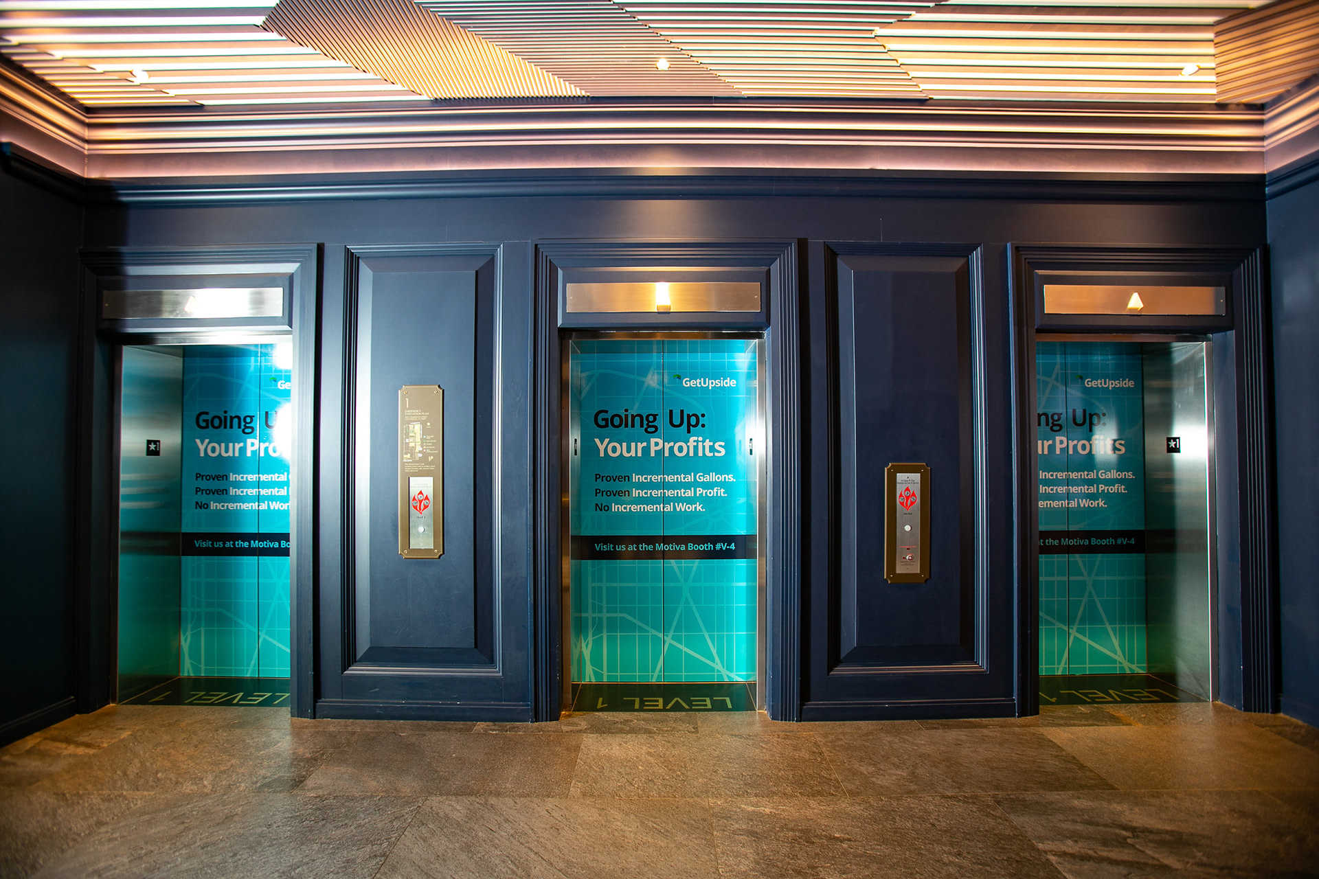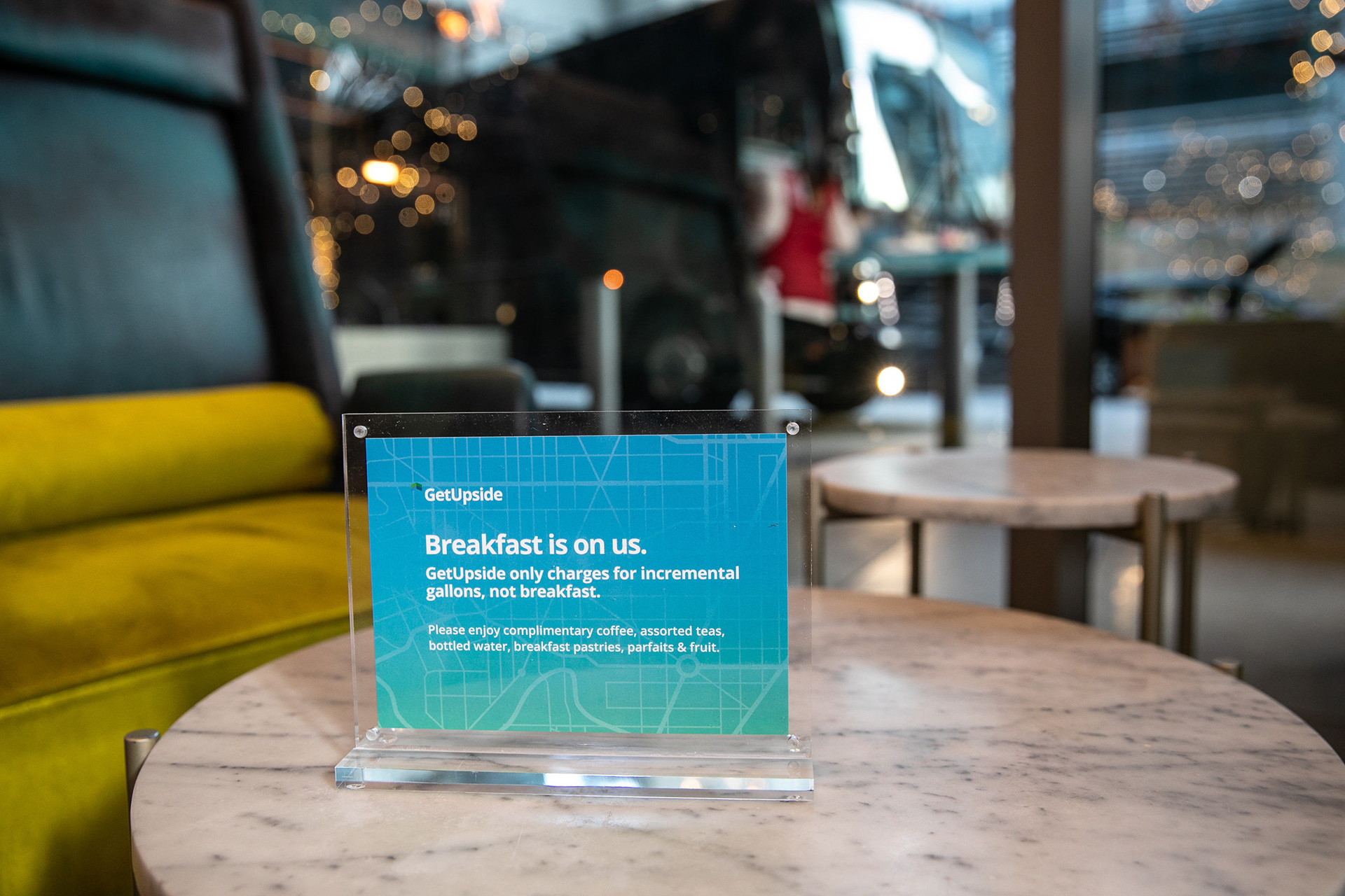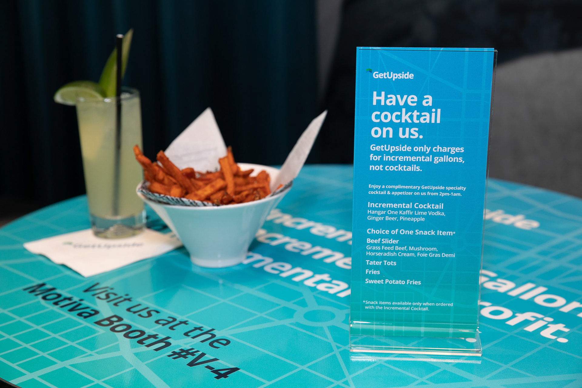 GetUpside wanted to raise brand awareness to guests visiting town for a fuel convention at the LA Convention Center. A nearby hotel lobby was transformed into a brand activation with graphics adorning the bar, cocktail tables and surrounding spaces. A fleet of SUVs were wrapped with custom graphics and used to transport attendees to the convention.