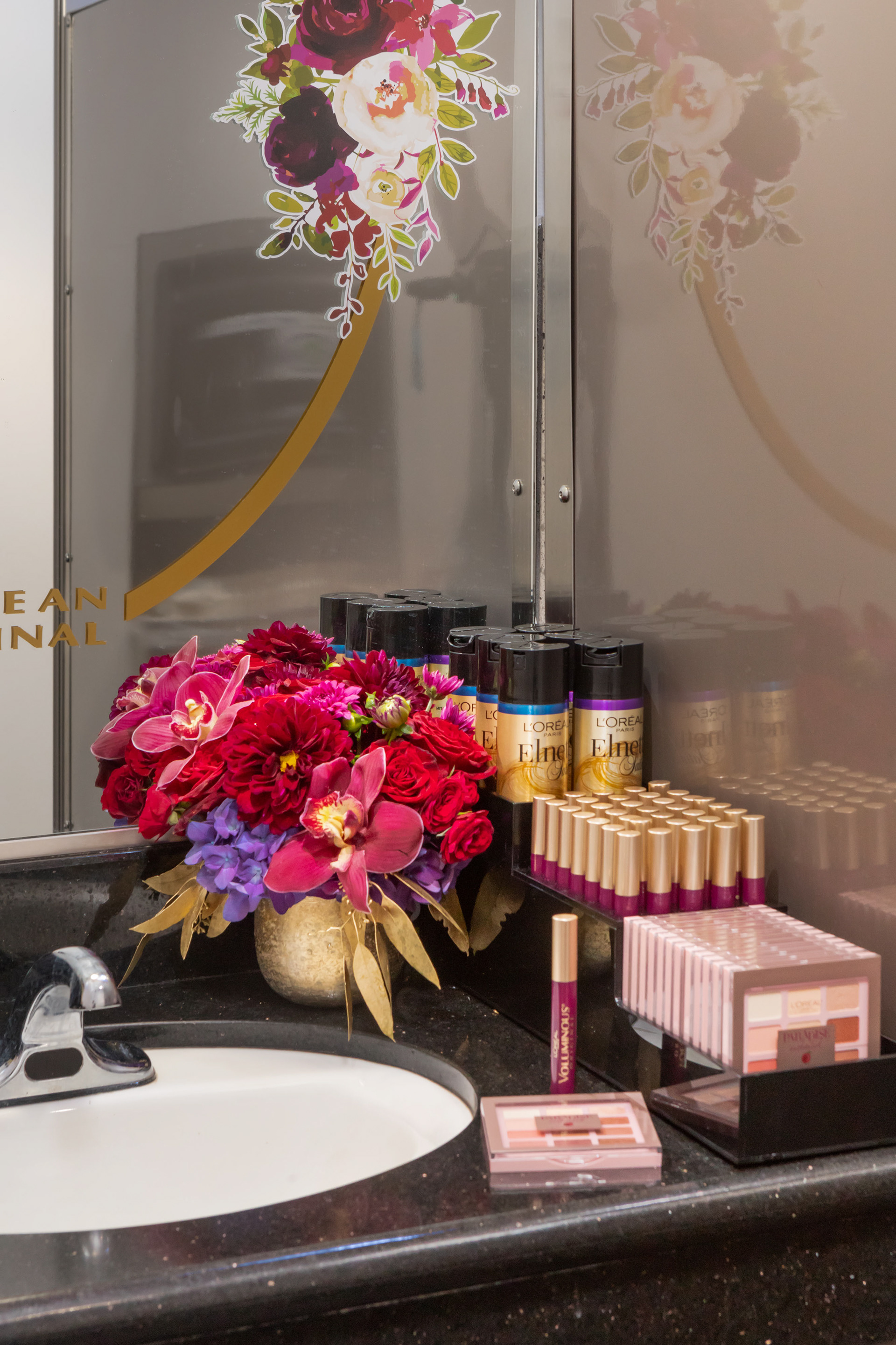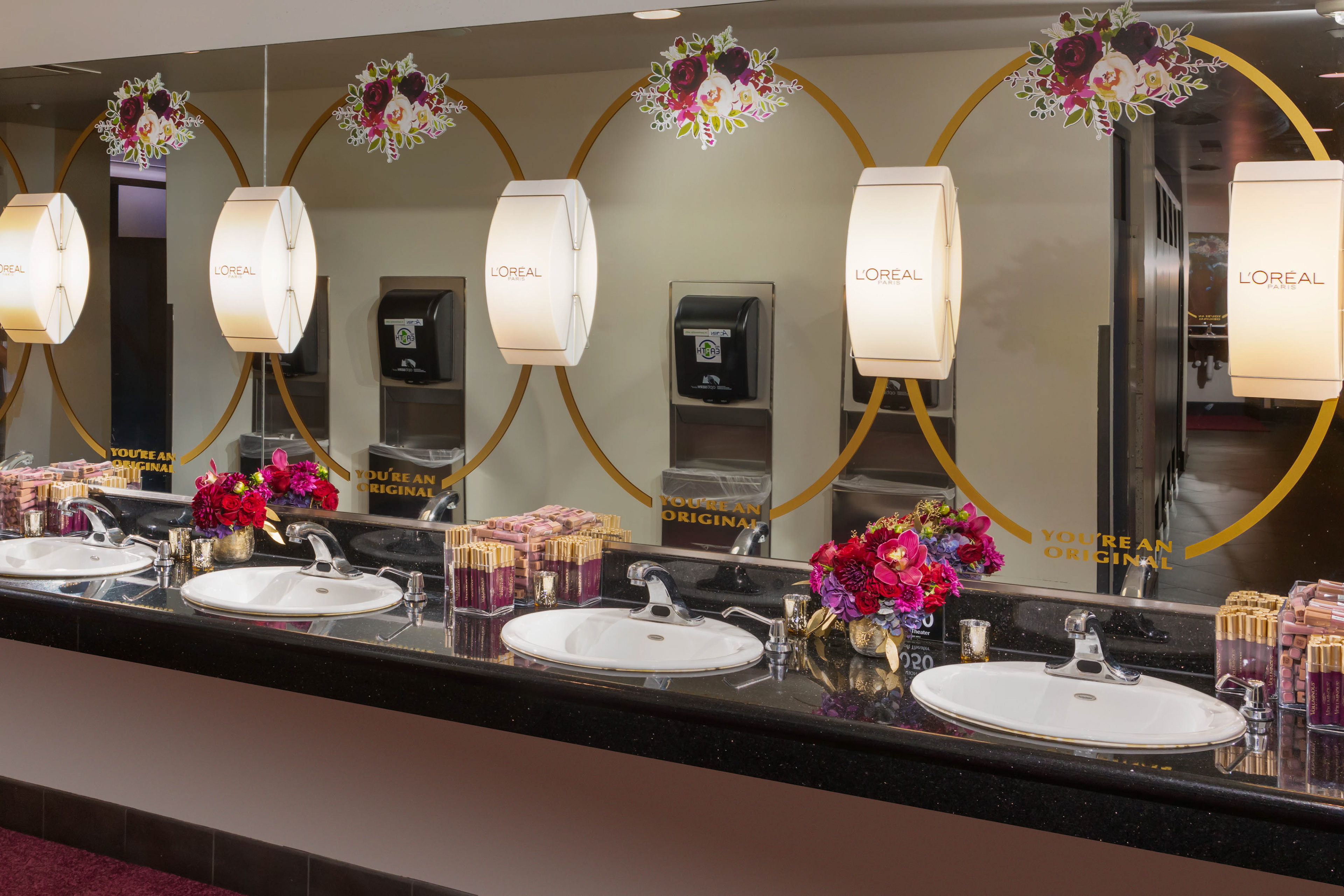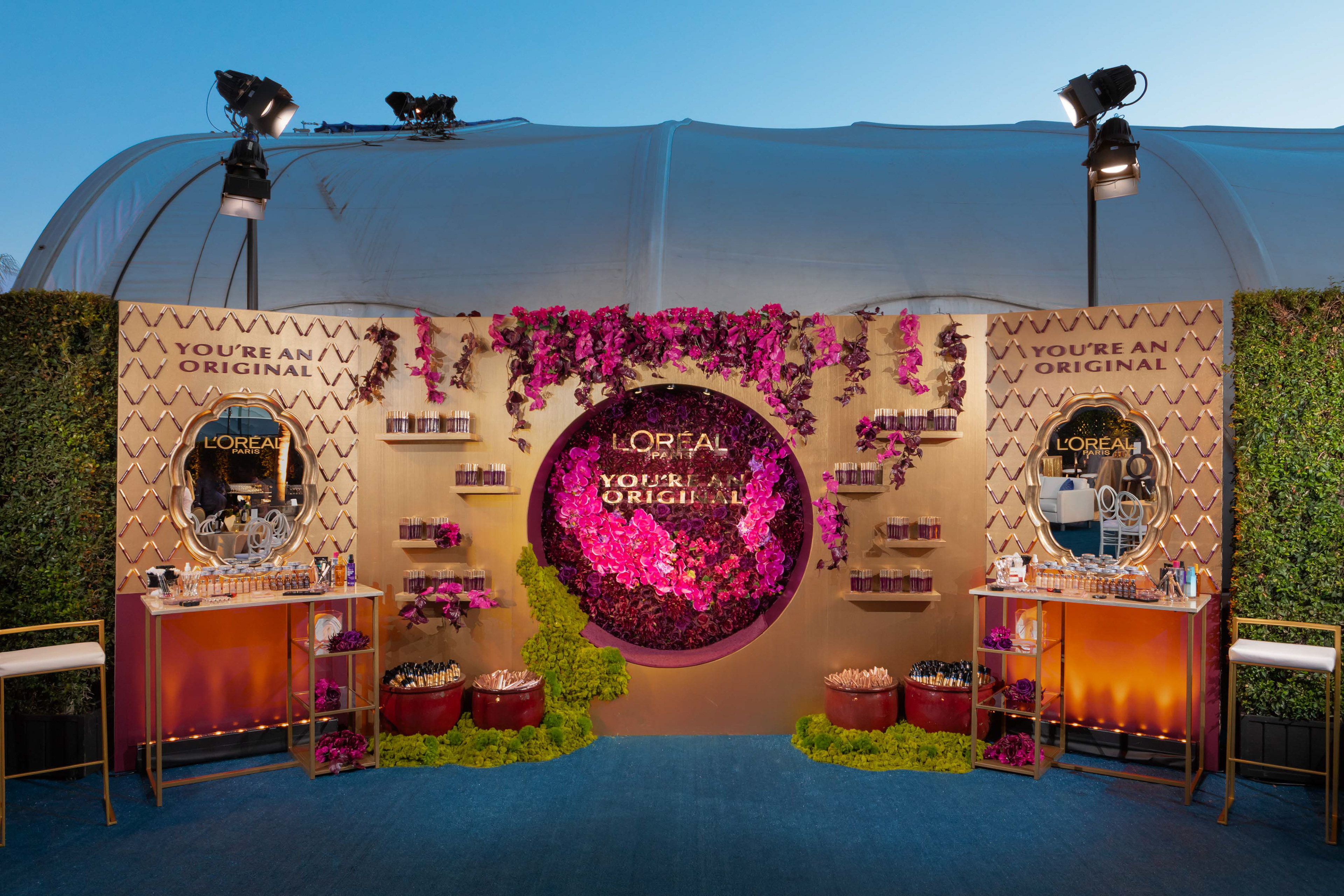 This brand activation for L'Oreal, is spread across 4 different events for the 70TH Primetime Emmys. Two custom touch-up stations were designed for the Governors Ball along with one for the Press Center, where guests received complimentary touch-ups and product. Maroon colored mascara was the hero product and the recessed, circular seat served as a photo moment featuring the brand's "You're an Original" tagline set into a floral backdrop. In addition, the Microsoft Theatre restrooms were transformed into a L'Oreal branded environment where Brand Ambassadors were stationed throughout the telecast to engage with guests and provide free samples. A smaller activation was installed at the Performers Nominee Reception where guests received complimentary mascara. Responsible for concept, design and fabrication as well as lead Producer of all 4 events.