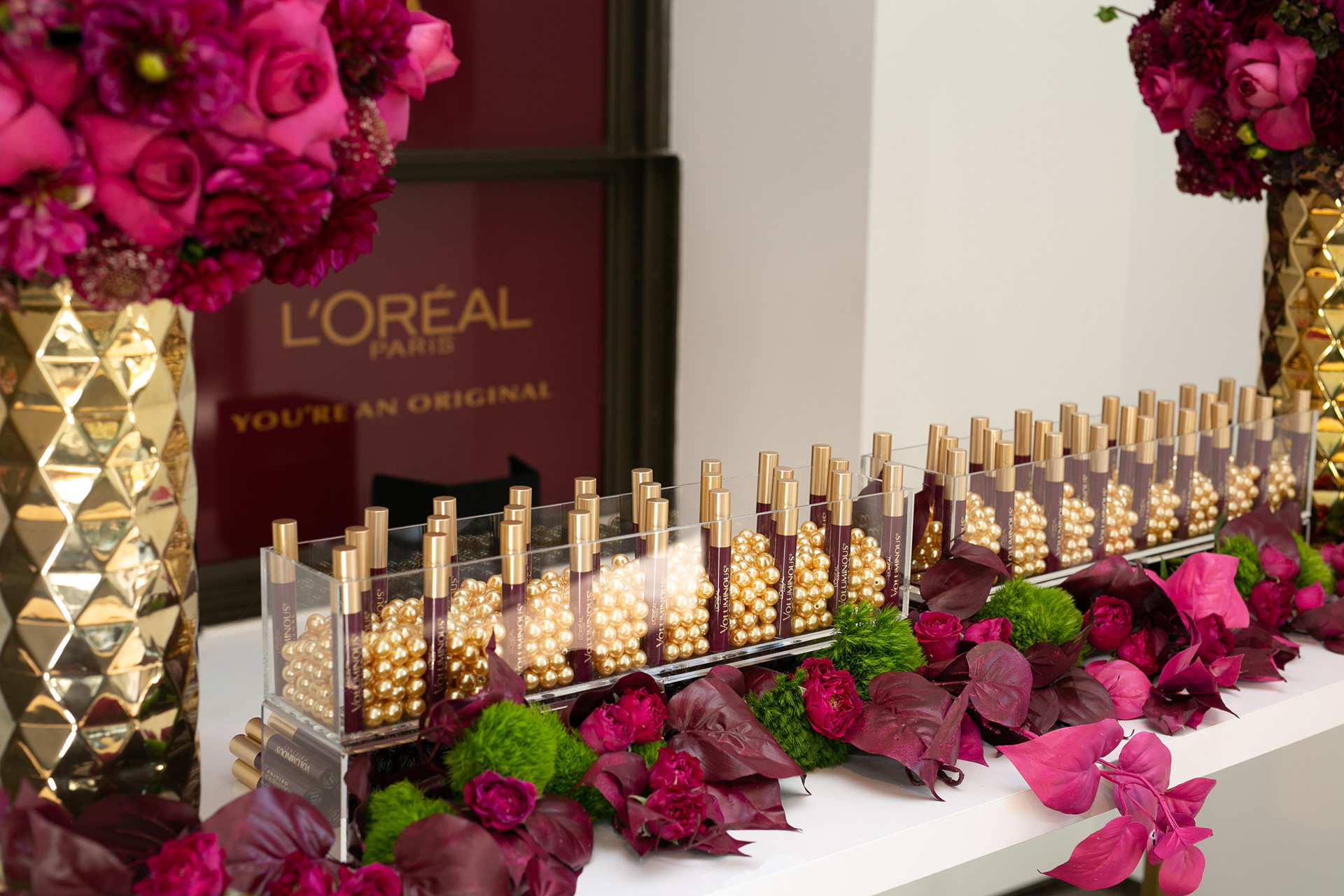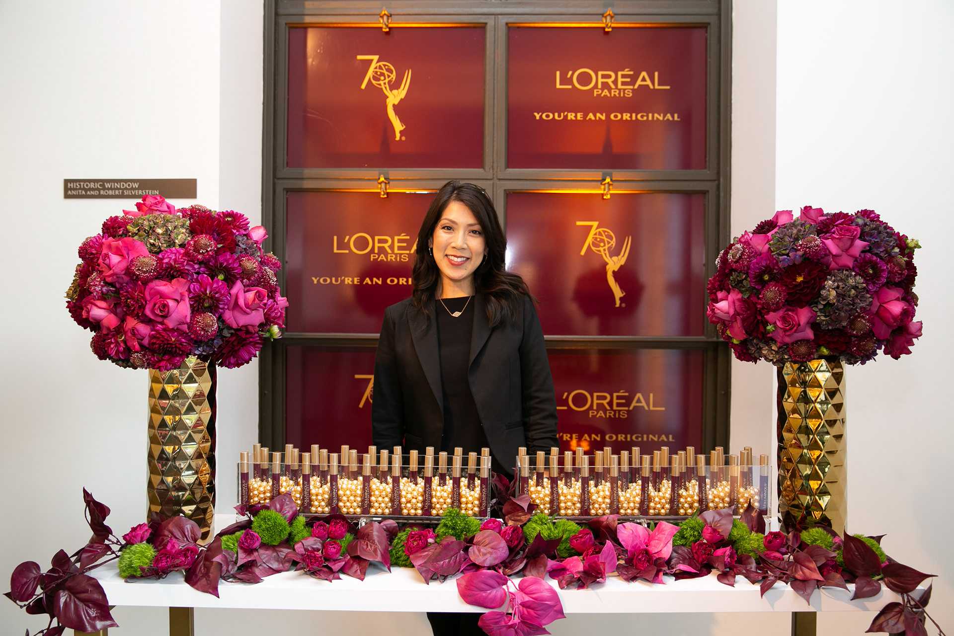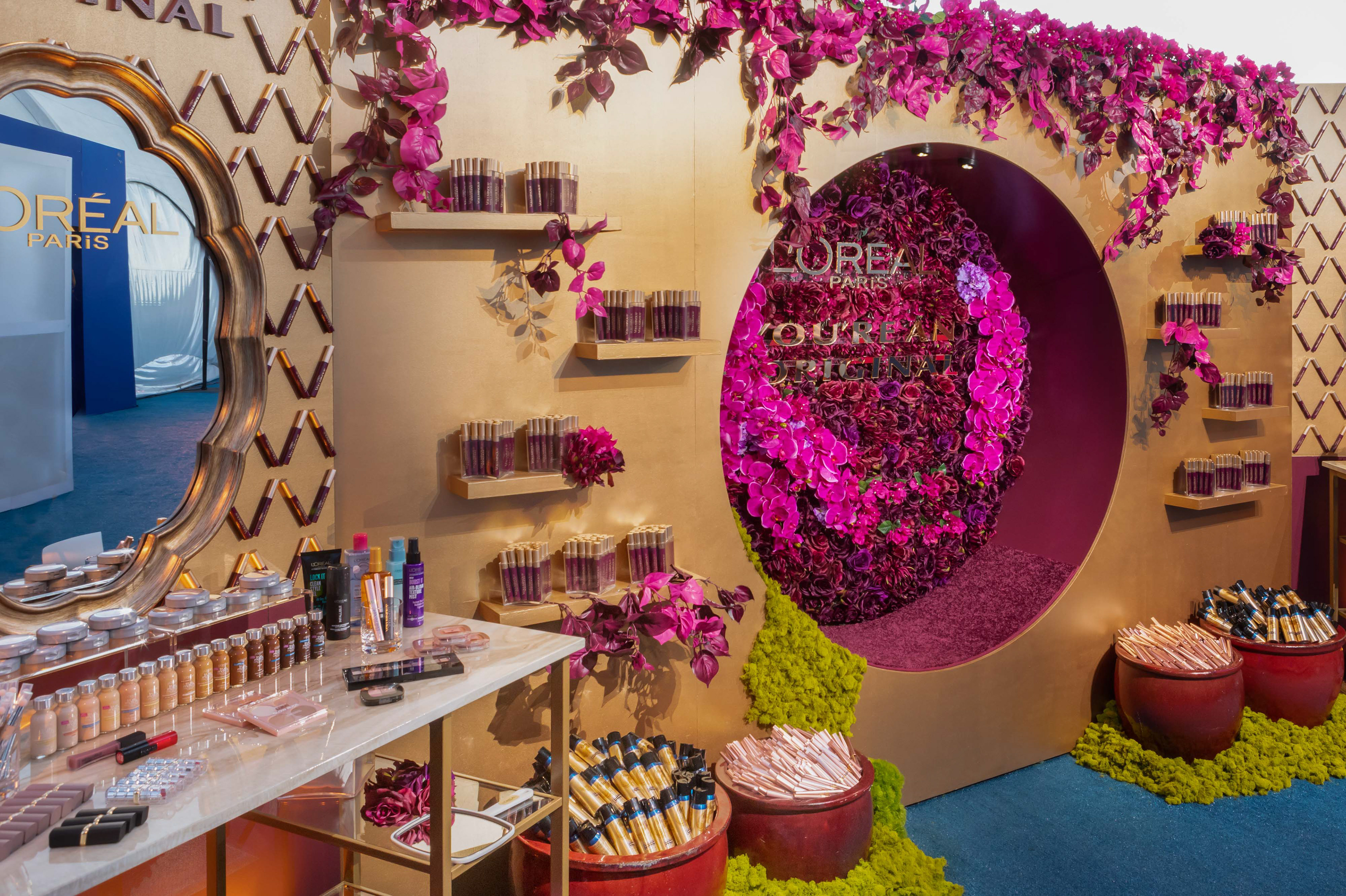 This brand activation for L'Oreal, is spread across 4 different events for the 70TH Primetime Emmys. Two custom touch-up stations were designed for the Governors Ball along with one for the Press Center, where guests received complimentary touch-ups and product. Maroon colored mascara was the hero product and the recessed, circular seat served as a photo moment featuring the brand's "You're an Original" tagline set into a floral backdrop. In addition, the Microsoft Theatre restrooms were transformed into a L'Oreal branded environment where Brand Ambassadors were stationed throughout the telecast to engage with guests and provide free samples. A smaller activation was installed at the Performers Nominee Reception where guests received complimentary mascara. Responsible for concept, design and fabrication as well as lead Producer of all 4 events.