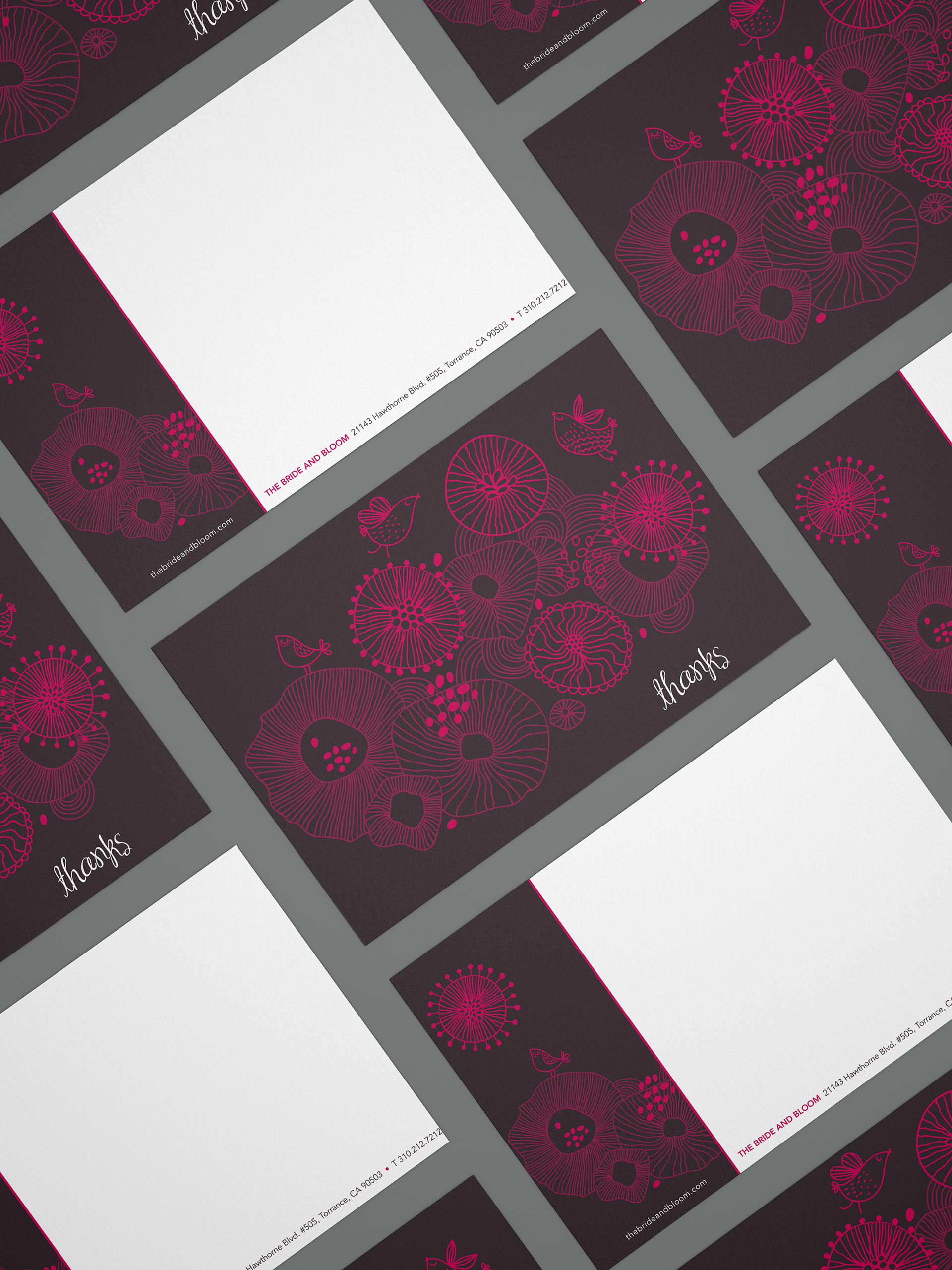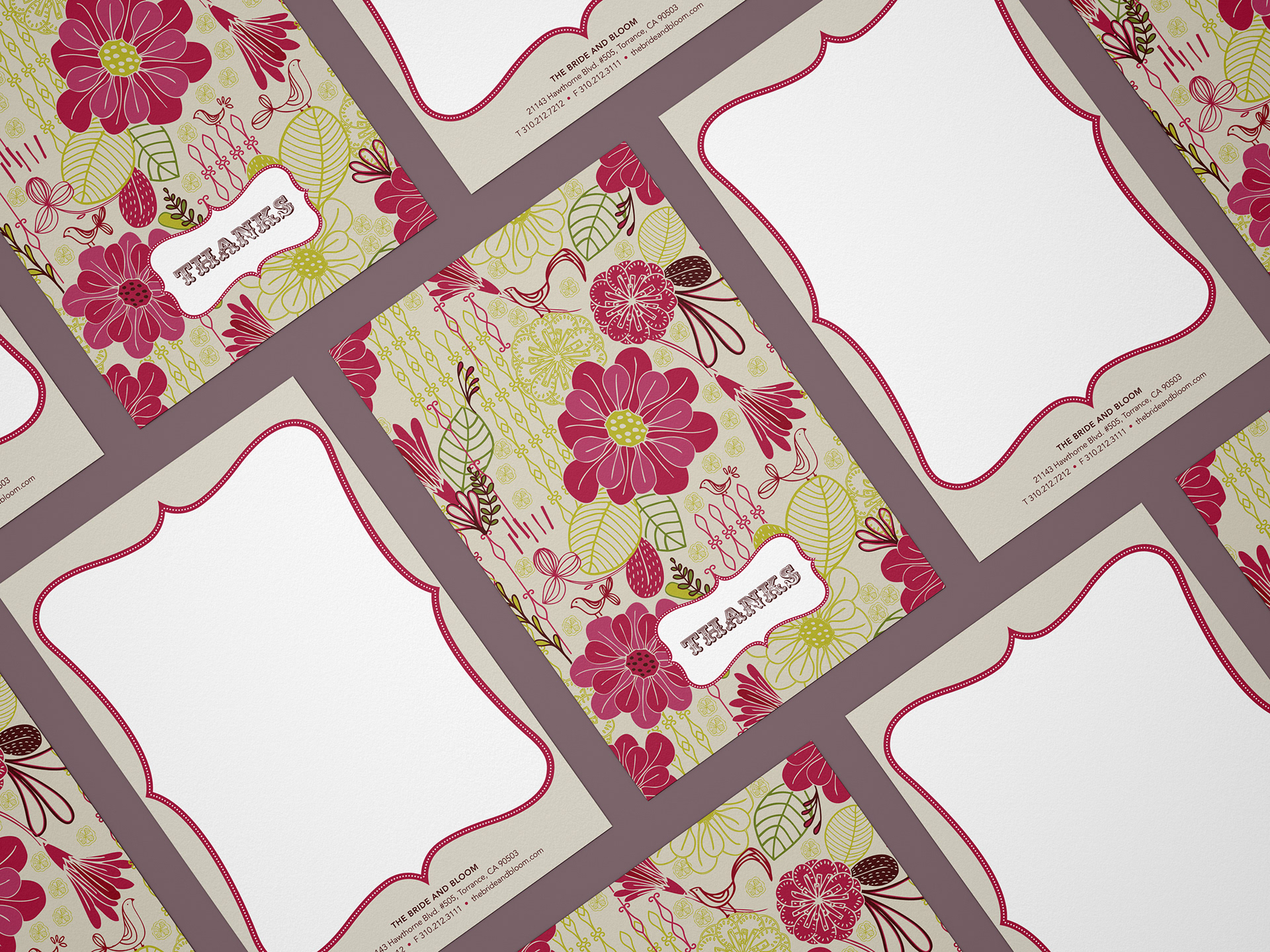 Custom note cards and favor bags & tags created for the Bride and Bloom magazine.