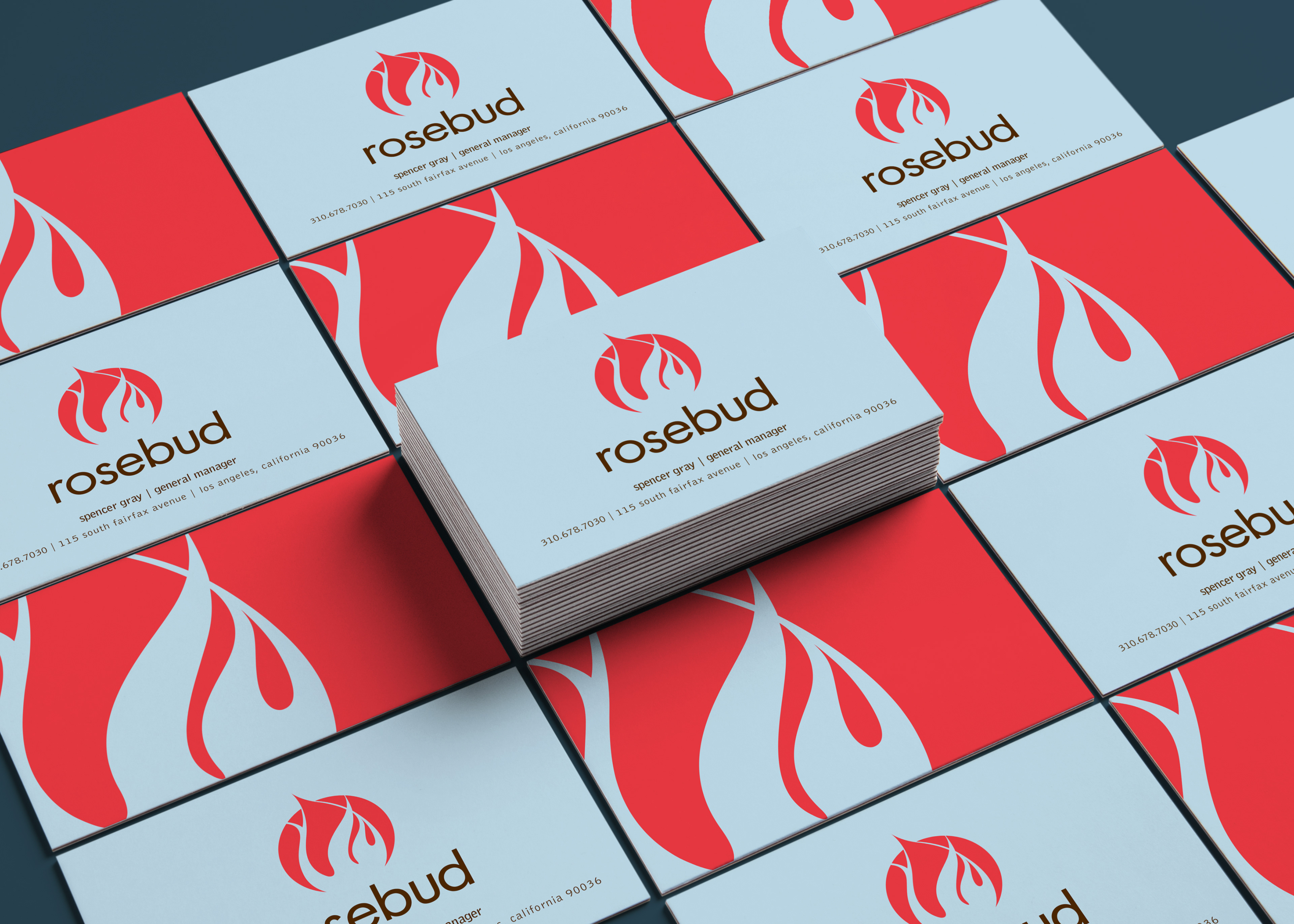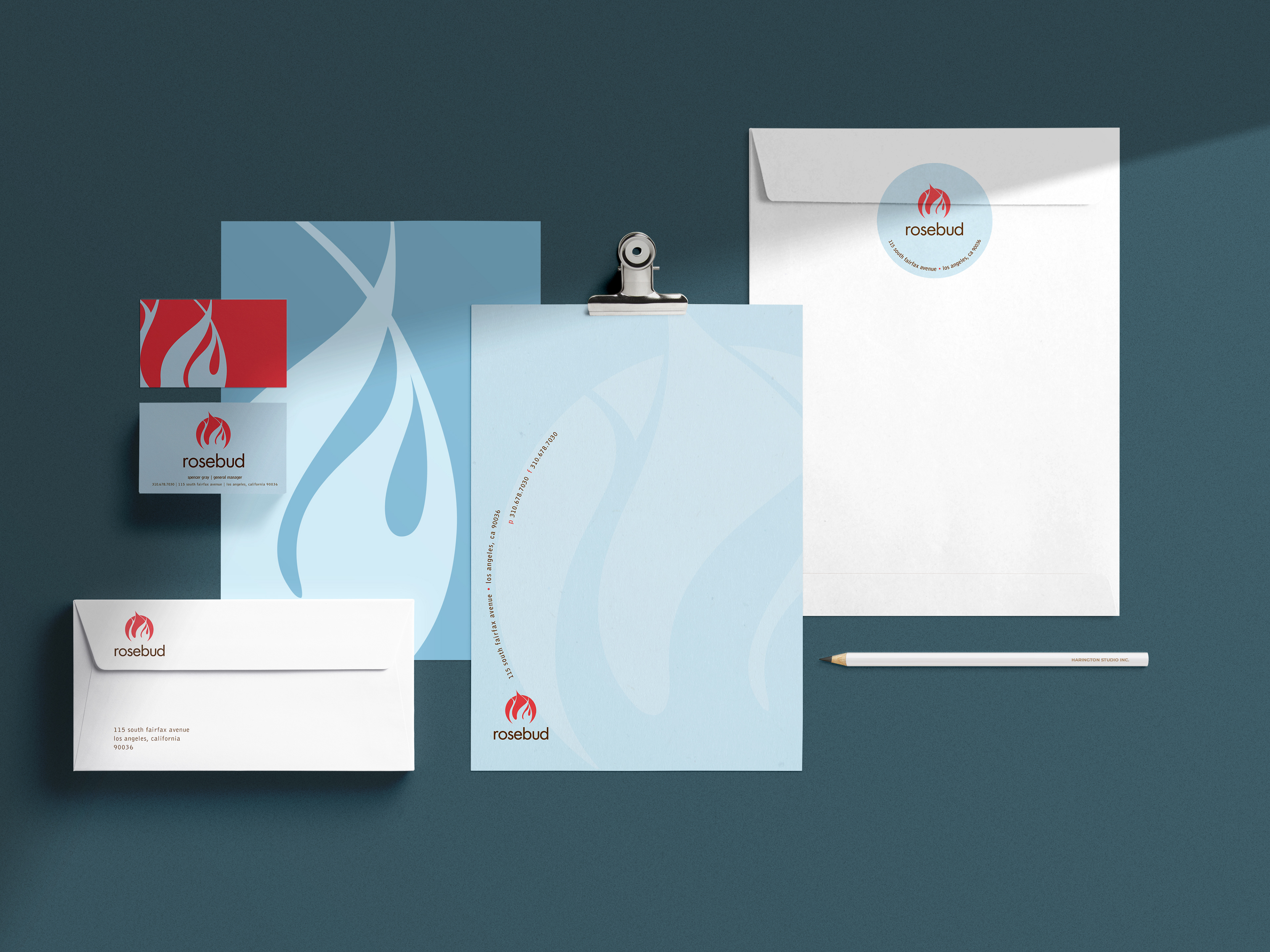 Rosebud restaurant specializes in menu items cooked in a wood burning oven. An identity system merging a bud and a flame was created that encompassed the essence of their cooking.